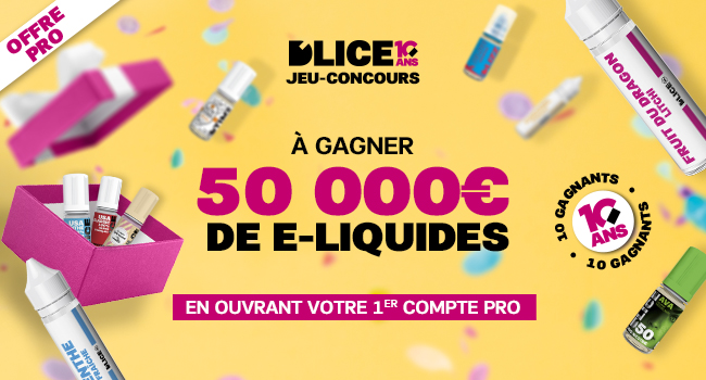 Pour prendre part au jeu-concours D’LICE La Rentrée des pros 2022, rendez-vous sur l’espace pro.dlice.fr et créez votre premier compte professionnel. Après validation de votre compte, vous serez alors automatiquement sélectionné pour participer au tirage au sort à l’issue de l’opération. Rendez-vous le 10 novembre pour découvrir si vous faites partie des heureux professionnels de la vape à avoir gagné pour 5000€ de e-liquides D’LICE (en valeur marchande).